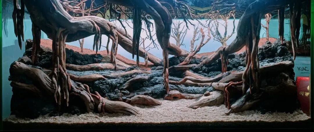 尤其值得称道的是它在视觉上营造出的“动态”之美。通过前景三根极具弧度的沉木与垂直树根的巧妙搭配,既丰富了视觉层次,又避免了过度强烈的冲击感所带来的压迫性,如同森林中翩翩起舞的树木,自成韵律。这种不依赖鱼群游动而呈现的动态感,尤为难得。
