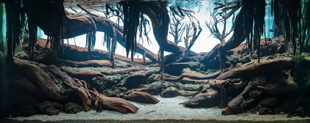 从前景至中景,再延伸至深邃如森林的背景,过渡异常流畅,形成一条既引人入胜又浑然天成的视觉路径。沉木的大胆蜿蜒结构,令人联想到古老雨林的根系;每一根木头的角度与走向都经过精心安排,不着痕迹地引导观者的视线穿梭于景中。这种结构处理带来了强烈的纵深感与视觉张力,使人如踏入真实的自然片段。