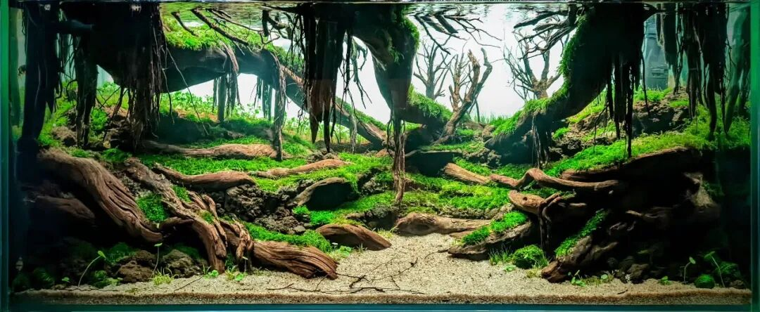 植栽安排同样令人赞叹。苔藓与多种叶形植物层次分明,粗砺与柔和的质感之间取得精妙平衡。沉木下方富有表现力的垂悬根须,与周围茂密的水草相映,极大地增强了造景的生态真实感。光线经过细腻调控——角度、强度与阴影的平衡——成功复现了阳光穿透茂密林冠的氛围。