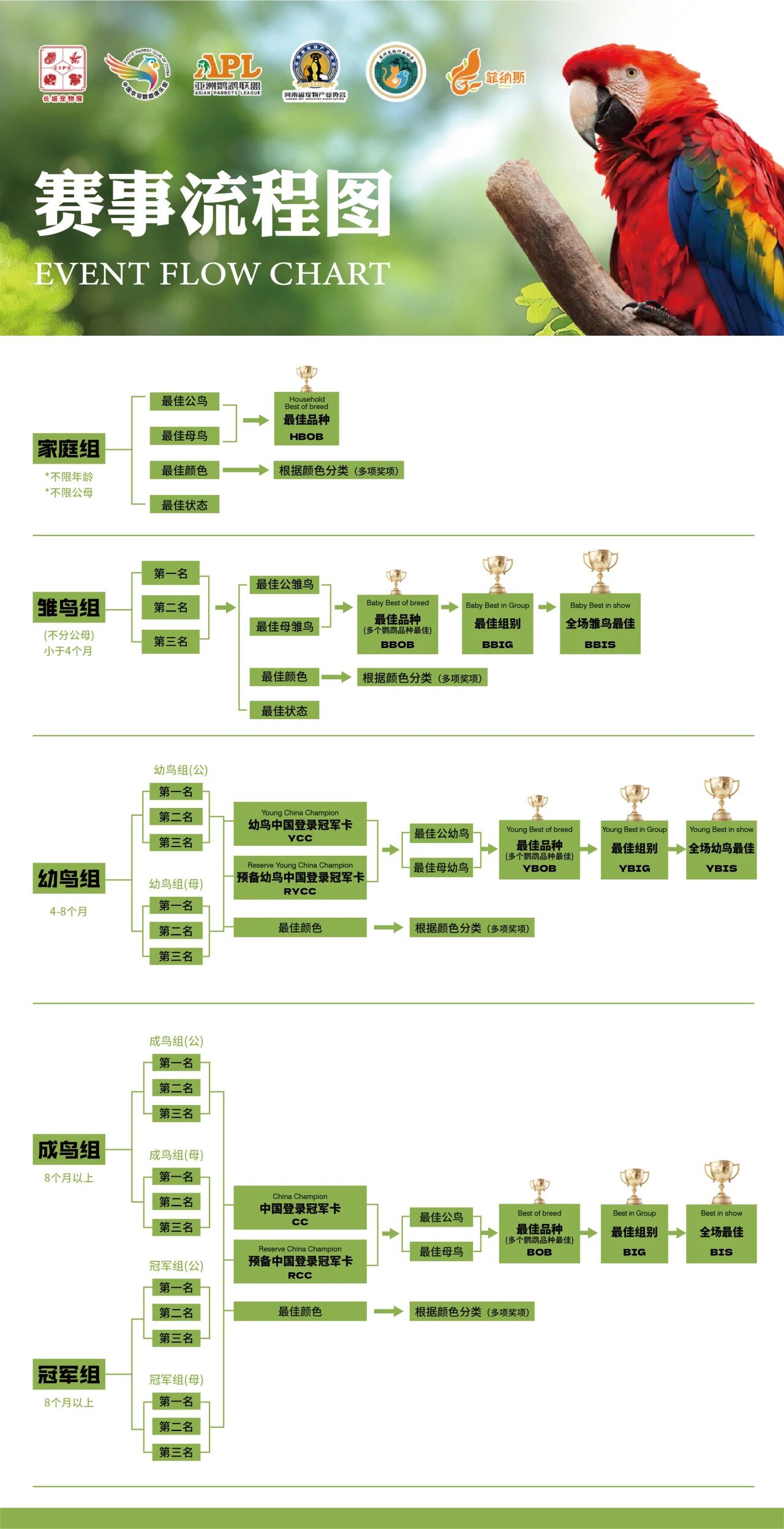 最佳鹦鹉组别冠军(Best in Group):每个组别按不同年龄组取前 1 至 4 名。