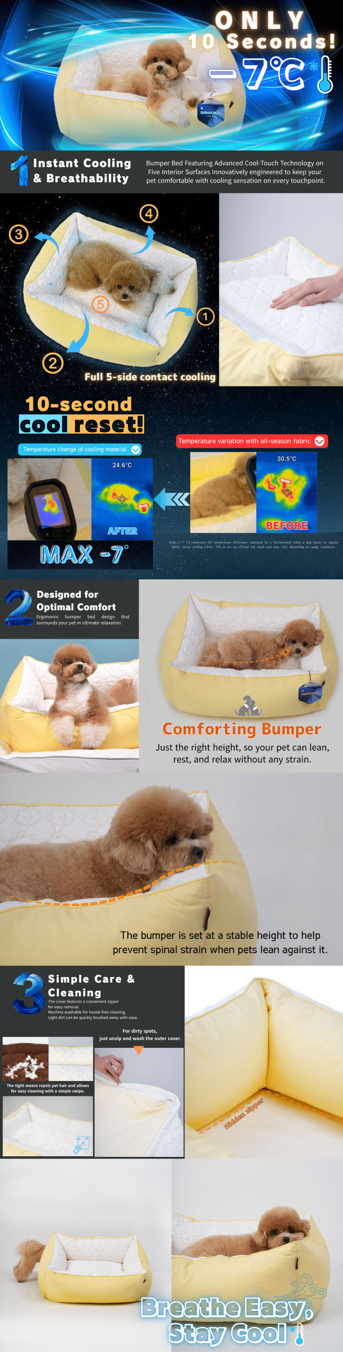 新品介绍:专为体温高于人类的狗设计,这款封闭式宠物床在接触狗皮肤的五个表面都采用先进的冷感面料,即刻带来清爽感。测试显示,仅需10秒即可降低约7°C,比传统夏季面料提供3–4倍的更强降温效果,让宠物在炎热天气中也能舒适休息。