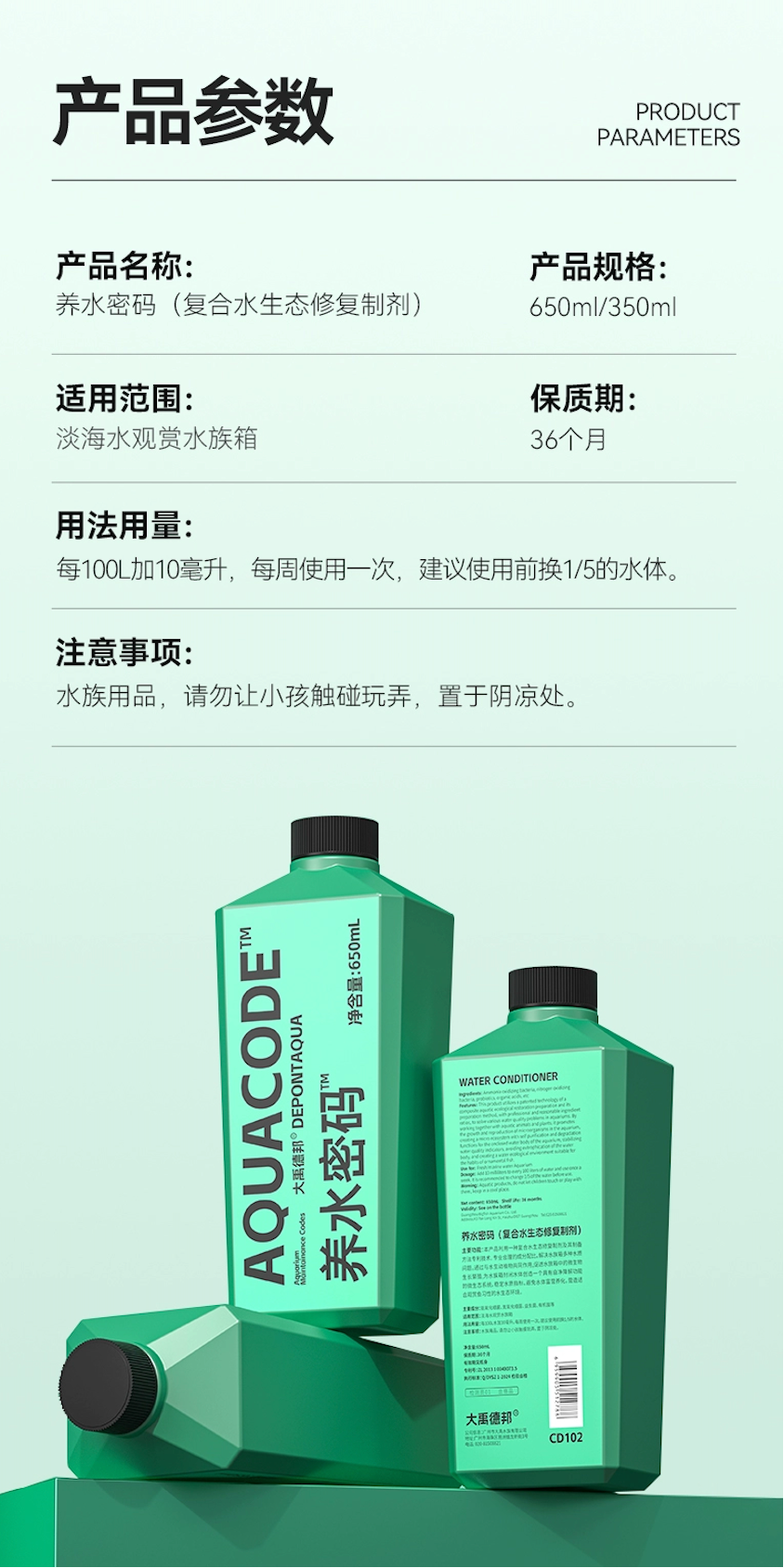 新品介绍:复合水生态修复制剂,专利技术发明科学配比各类益生菌与有机酸等成分,加入到鱼缸中能快速形成有益的微生物菌群,为鱼缸打造“自净生态系统”,让水质清澈、鱼儿健康。一站式解决鱼缸水质难题: