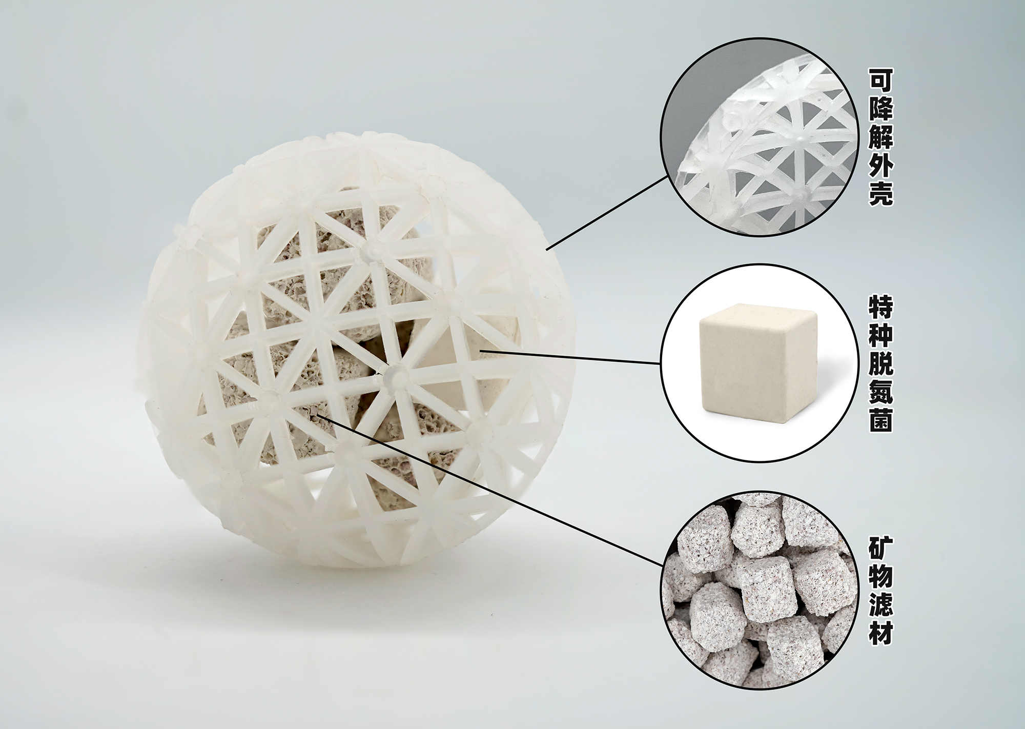 外壳是基于特殊生物发酵技术研发的可降解材料制成,在水中通过精准控制多糖的缓释过程,为精心选育的特种脱氮菌提供养料;