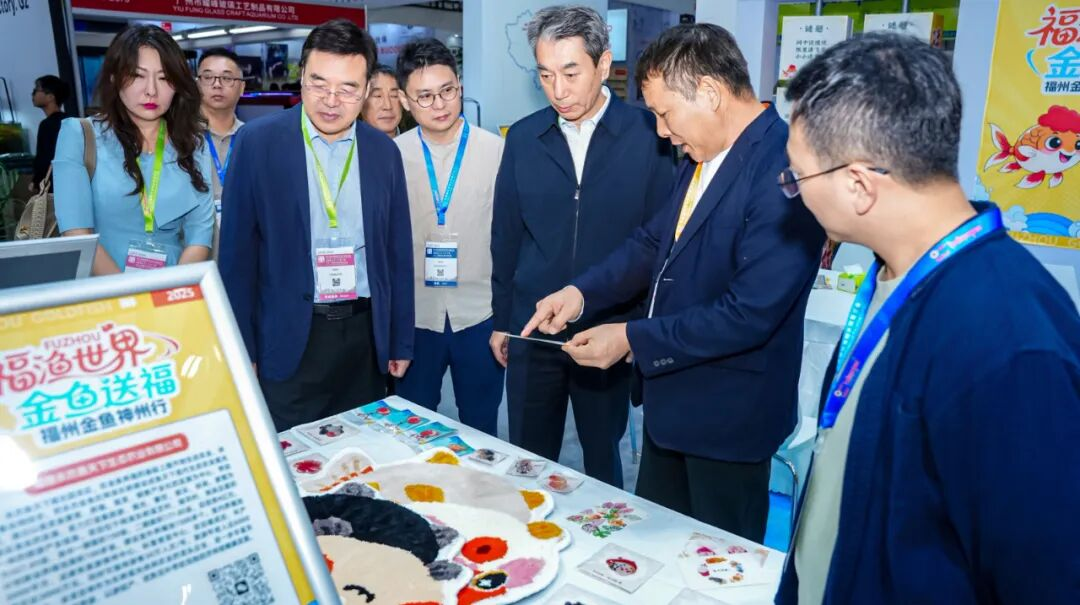 现场共设置8个金鱼展示缸,展示80余尾特色福州金鱼,福寿雍容高贵、狮头威武雄健、蝶尾翩跹似舞、琉金流光溢彩……每一尾金鱼皆是匠心育种的结晶,吸引大量专业买家、行业专家及市民观众驻足观赏、洽谈合作。现场人流如织,反响热烈。中国渔业协会崔利锋会长一行也到场参观指导。