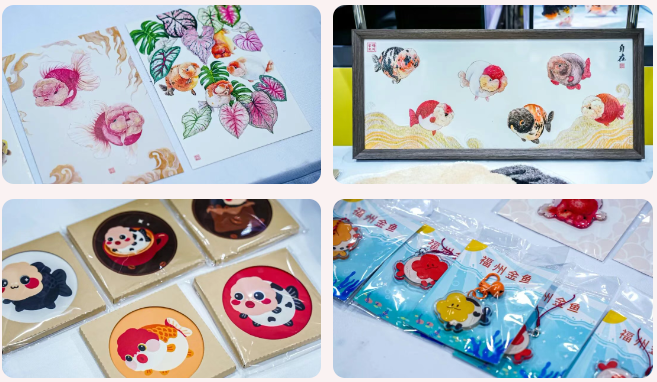 展区还特别呈现福州金鱼文创成果,将“水中精灵”转化为可触可感的生活美学。金鱼主题版画首次集中展出,《鱼肥家润》《风生水起》《时来运转》赋予了金鱼美好的寓意;推出的系列文创周边——金鱼杯垫、金鱼地毯、金鱼冰箱贴等产品,设计精巧,充分展现福州金鱼从“观赏品”向“文化消费品”的延伸潜力。