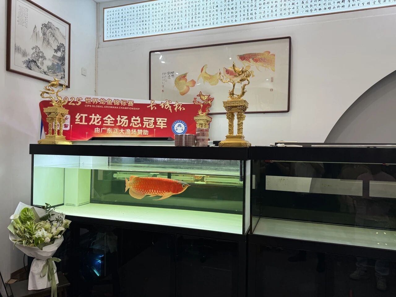 总冠军红龙是一尾尺寸足足70+,鲜艳的正红,长身,扇尾,超大关刀鳍,炮弹头个体。它足够大,足够红,足够完整,就是它的独特之处,是它独领风骚的资本。